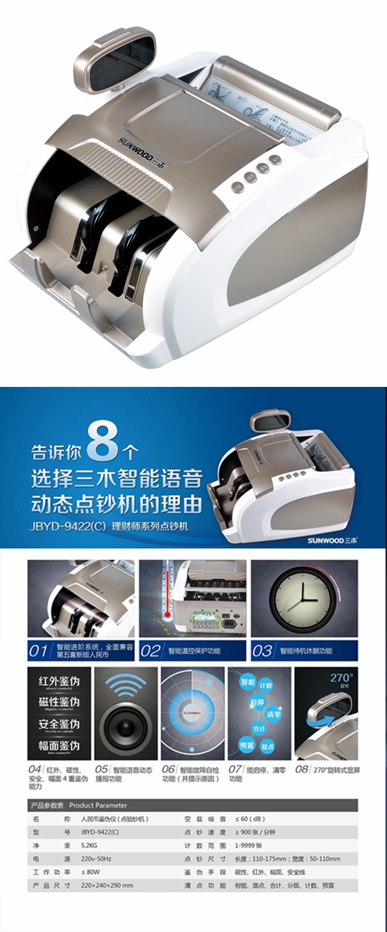 • 商品名称:三木JBYD-9422点验钞机 智能验钞机 支持检测新币 语音红外磁性鉴伪 三木9422