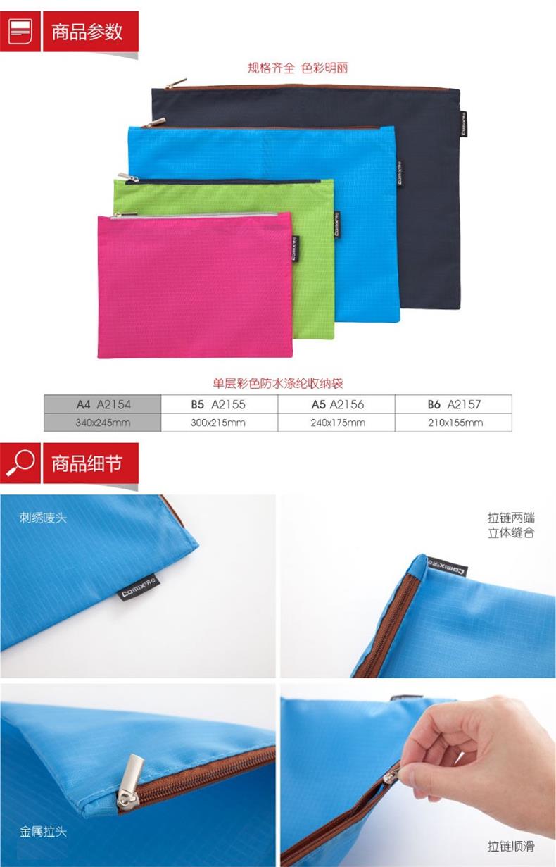 5. 齐心单层彩色防水收纳袋A4,A2154深蓝,绿
