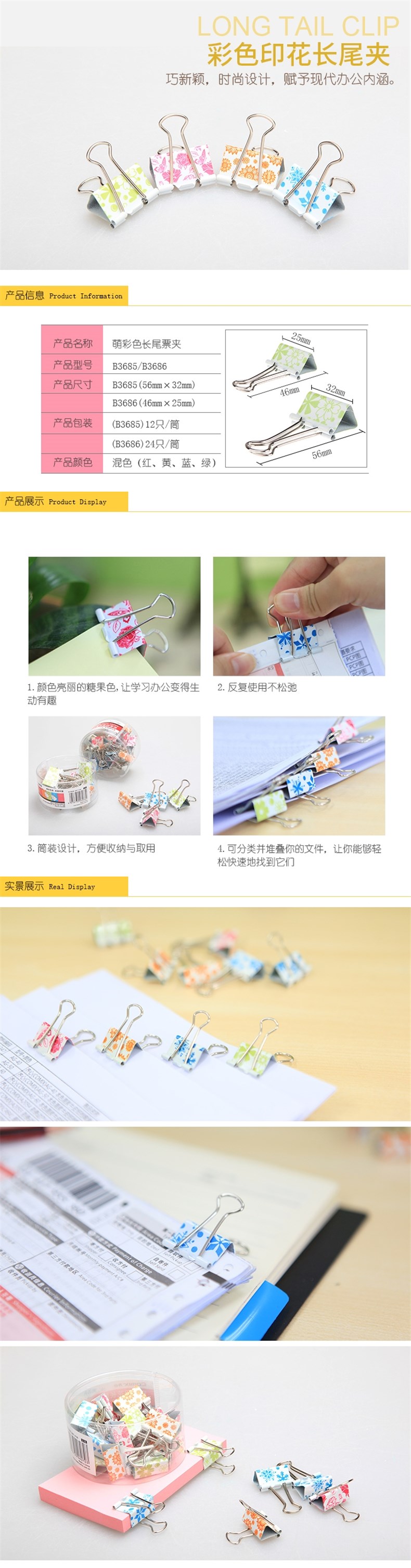 齐心B3686彩色印花长尾夹4号(配)