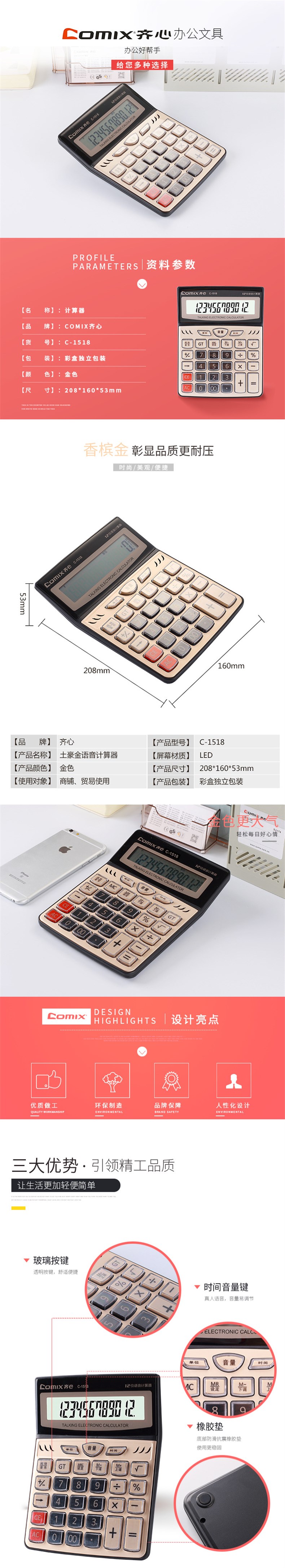 齐心C-1518语音计算器 土豪金