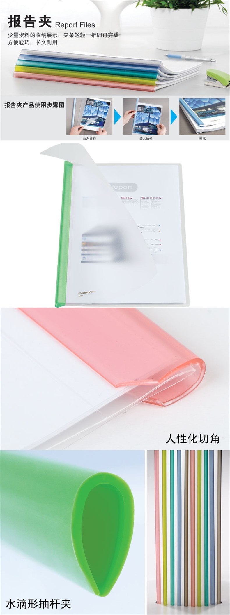 5. 齐心A856五色晶彩抽杆夹A4