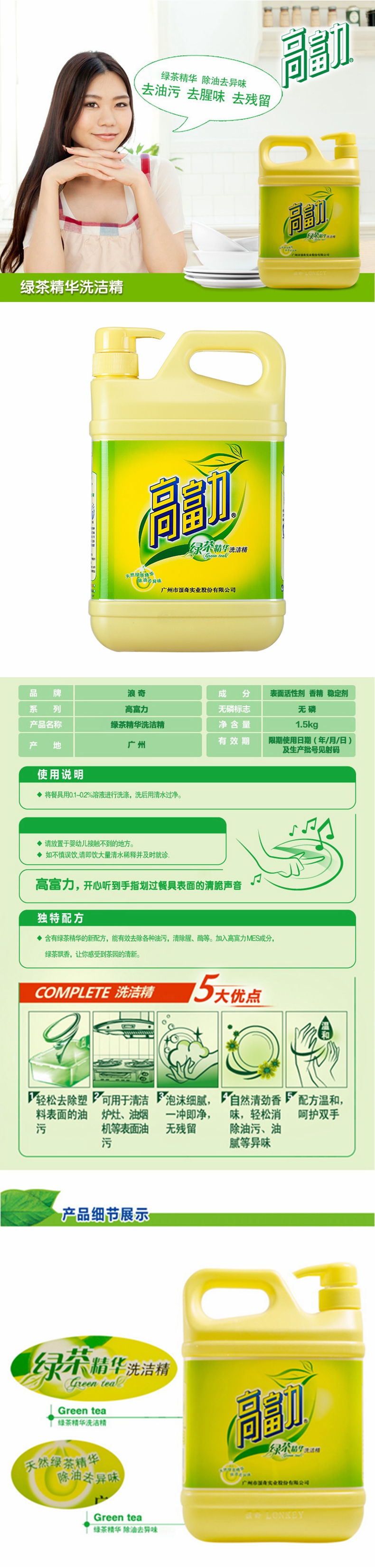 5. 高富力绿茶味洗洁精1.5KG