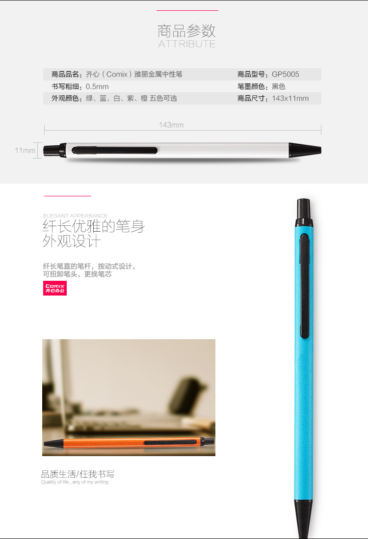 5. 齐心GP5005雅丽中性笔 珍珠蓝0.5