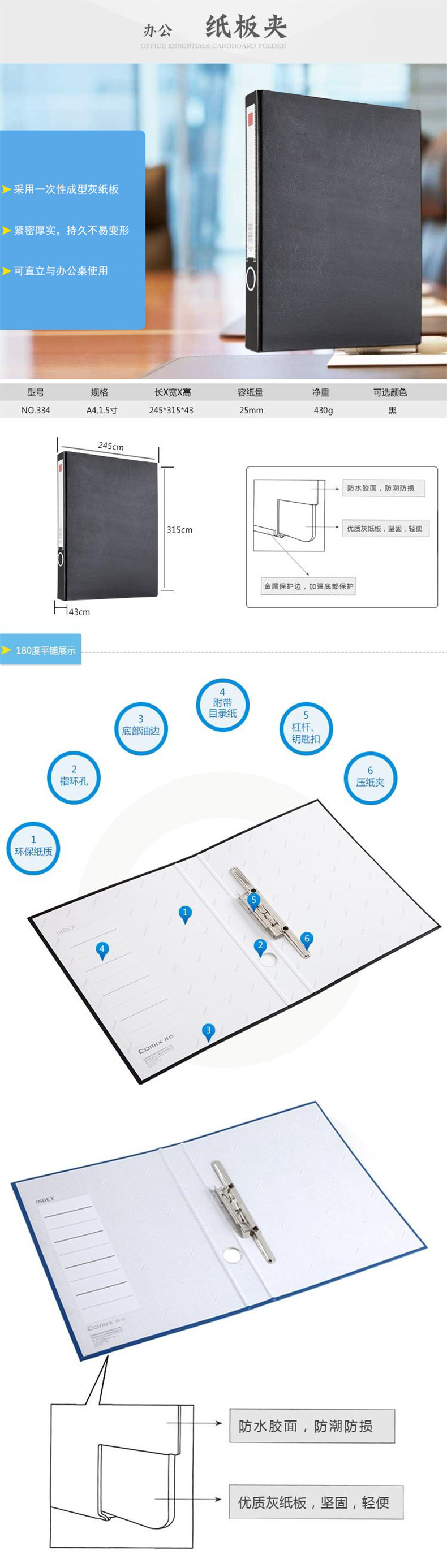 5. 齐心NO.334纸板夹A4长押夹(蓝色)