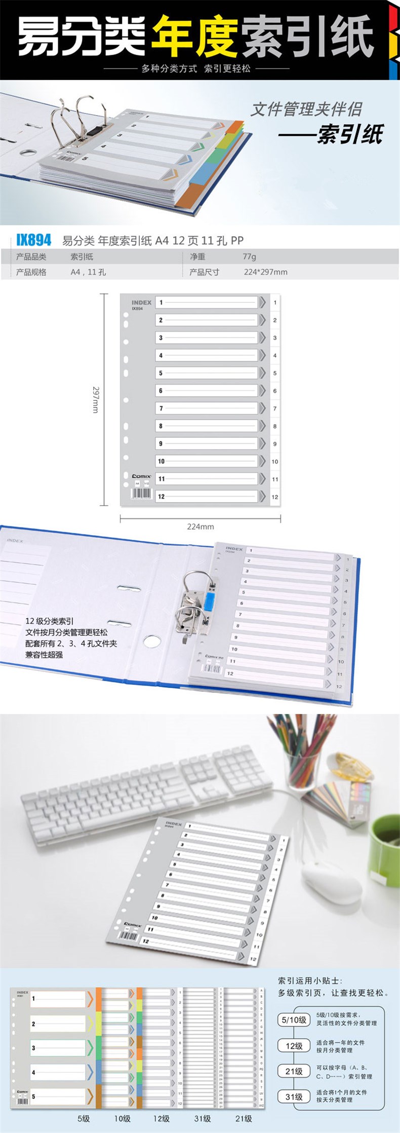 • 齐心IX894年度分类纸A4/12页/11孔/PP