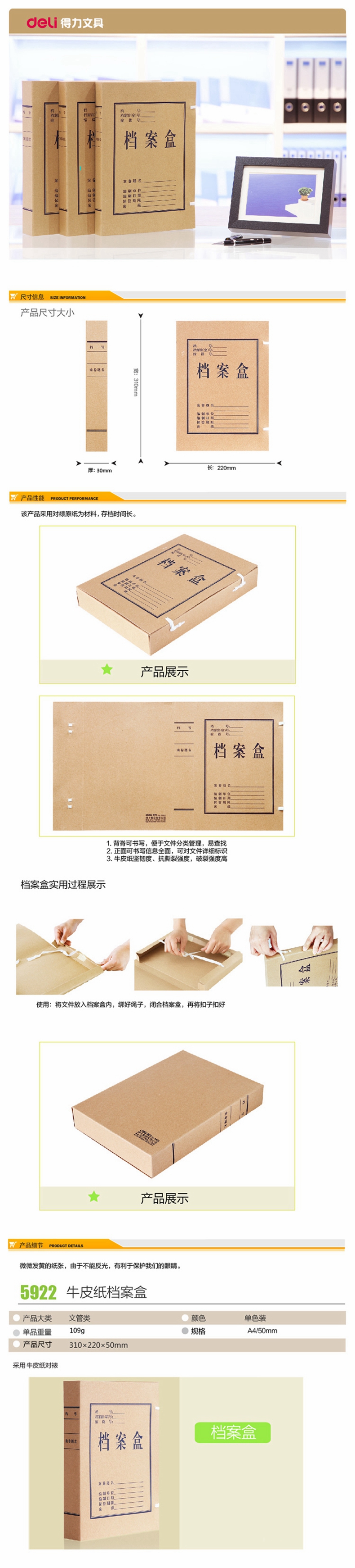 5. 得力5922牛皮纸档案盒(黄)310*220*50mm(10只/包)
