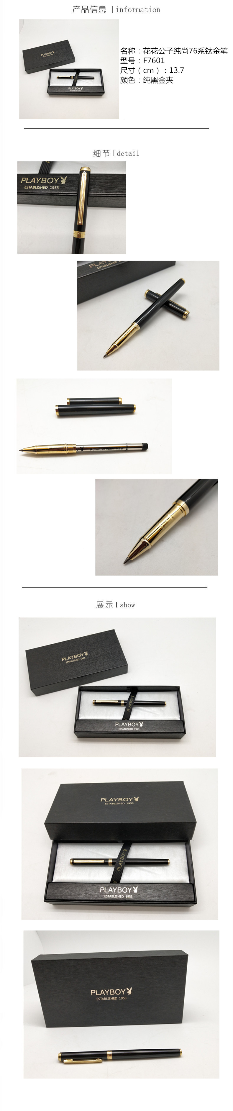 花花公子纯尚76系纯黑金夹钛金笔F7601