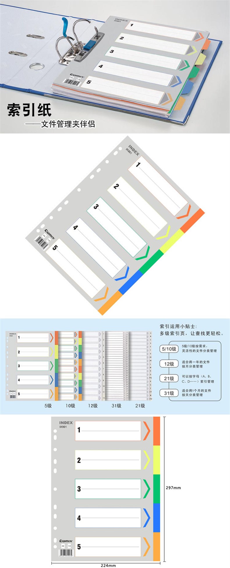 4. 齐心IX901五色分类纸A4/11孔/PP