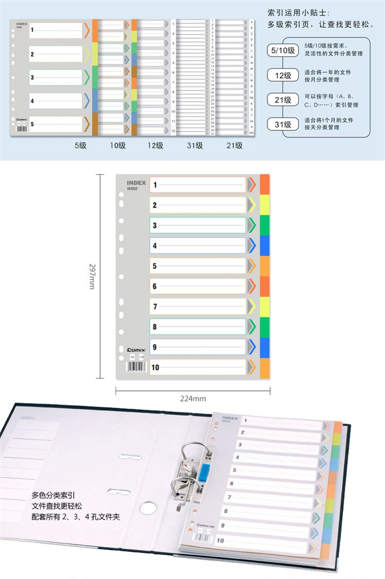 • 齐心IX901五色分类纸A4/11孔/PP